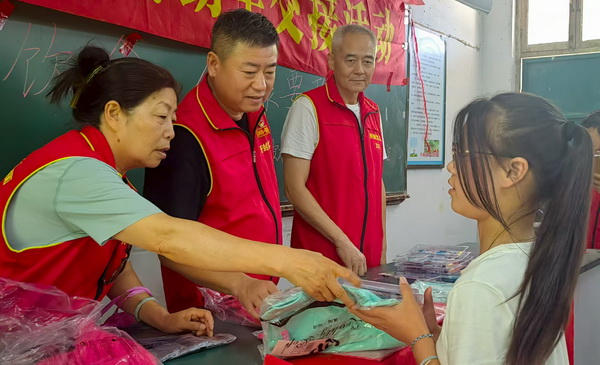 ![]() 为孩子们发放体恤衫和文具 摄影 徐建华