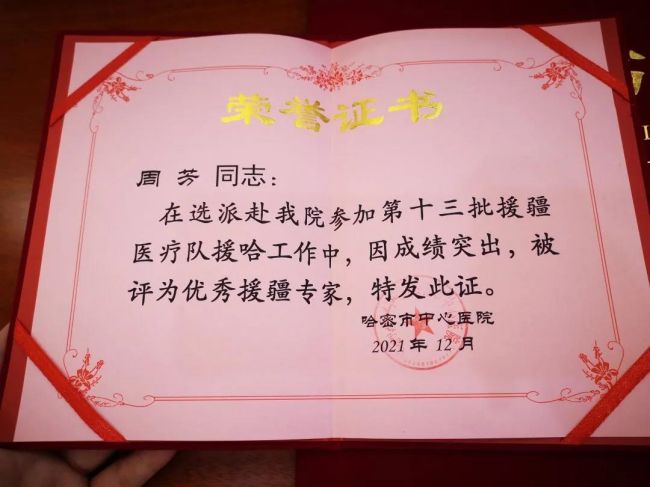 一分耕耘,一分收获。周芳以她谨慎、高度负责的职业精神和对待患者的温柔与善良,收获了当地人民的赞誉,得到了当地领导和同事们的认可,2021年12月,周芳被新疆哈密市卫健委和哈密市中心医院评为“2021年度卫生援疆工作先进个人”、“优秀援疆专家”。