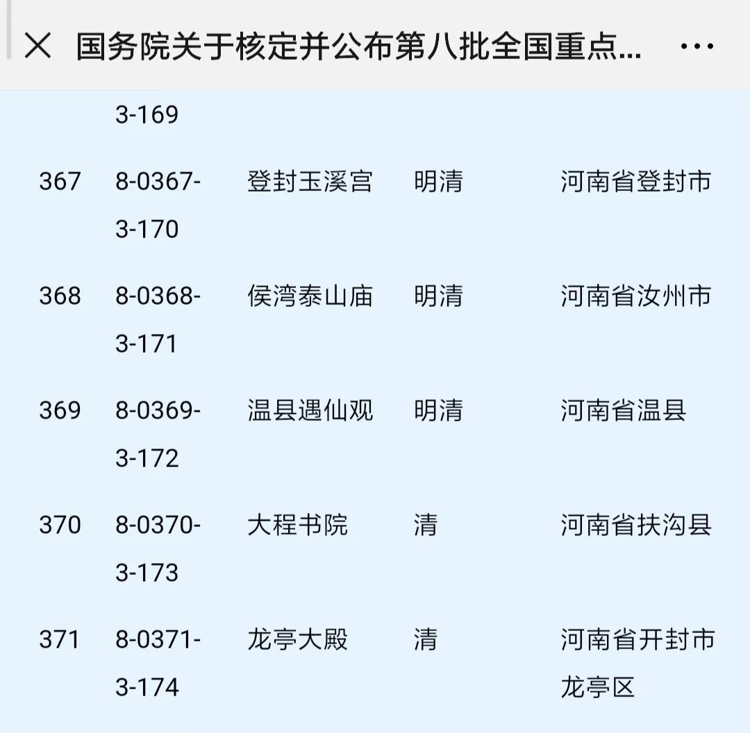 2019年10月7日发布了国发[2019]22号文《国务院关于核定并公布第八批全国重点文物保护单位的通知》文中公布了全国重点文物保护的古遗址167处、古墓群30处、古建筑280处,其中开封市龙亭景区内的龙亭大殿核定为全国重点文物保护古建筑。