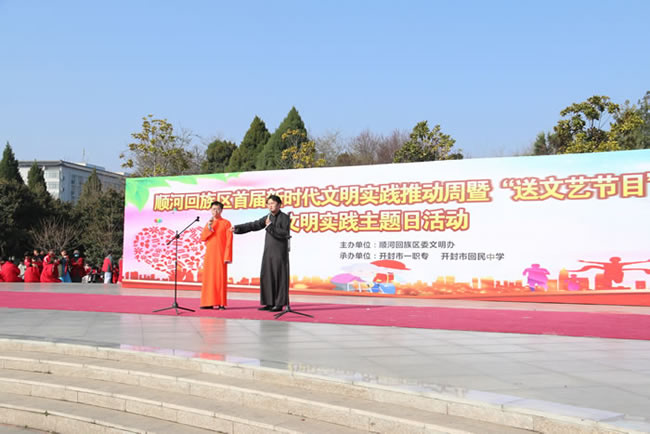 三月春风,文明相伴。3月4日上午,顺河回族区首届新时代文明实践推动周暨“送文艺节目”文明实践主题日活动在汴京公园圆形广场举行。来自开封市一职专、开封市回民中学的师生文艺志愿者,通过精彩的文艺演出开展文明行为、文明乡风宣传,为群众送上文化大餐。顺河区委常委、宣传部长史占伟,顺河区委文明办主任王艳红,开封市一职专和开封市回民中学校领导,汴京公园党支部书记杜娟和群众一起观看了演出。