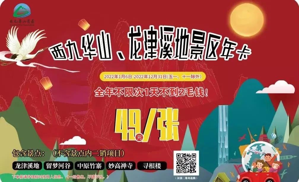 为了回馈广大游客对西九华山和龙津溪地的喜爱与支持,西九华山、龙津溪地发放49元年卡!全年不限次数游玩(包含龙津溪地、留梦河谷、中原竹寨、寻根楼、妙高禅寺门票)。下方扫码购买!