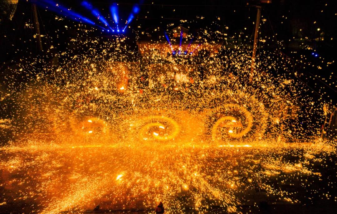 沙河灯火照山红,歌鼓喧喧笑语中。