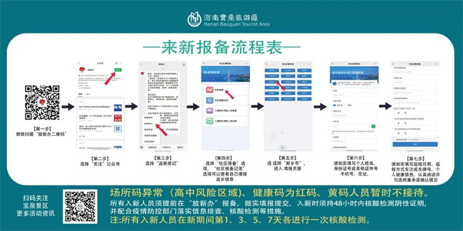 3、新乡市以外人员需持48小时内核酸检测阴性证明,实行落地即检(宝泉景区游客大厅对面4元/人提供核酸检测服务),同时需提前在支付宝“豫事办”、微信“放新办”进行报备,如实填报信息并提交。查验行程码、健康码,扫场所码后通过景区内“新乡市域外游客通道”方可入园;