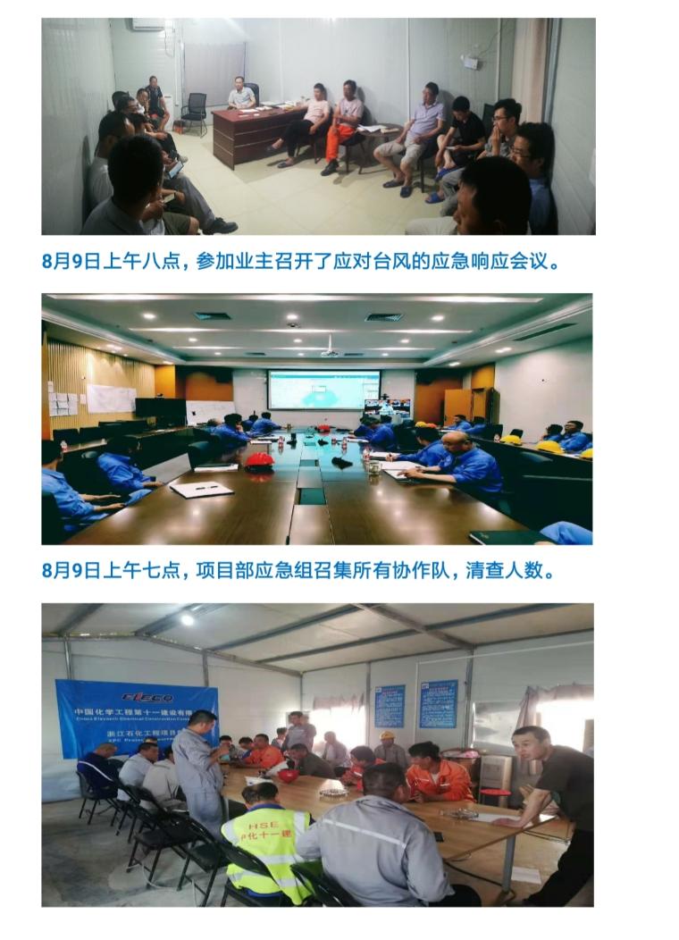 在员工生命及国家财产受到严重威胁之时,中国化学工程第十一建设有限公司浙石化项目部审时度势,及时统一部署下,防台防汛工作“提前布置、应对得当”,防抗台风期间克服了各种困难,确保所有人员大规模疏散避险,各科、队及协作队伍协力奋战,本次防台防汛工作取得了“无人员受伤、无重大财产损失”的好成绩,确保了员工生命和公司财产的安全。